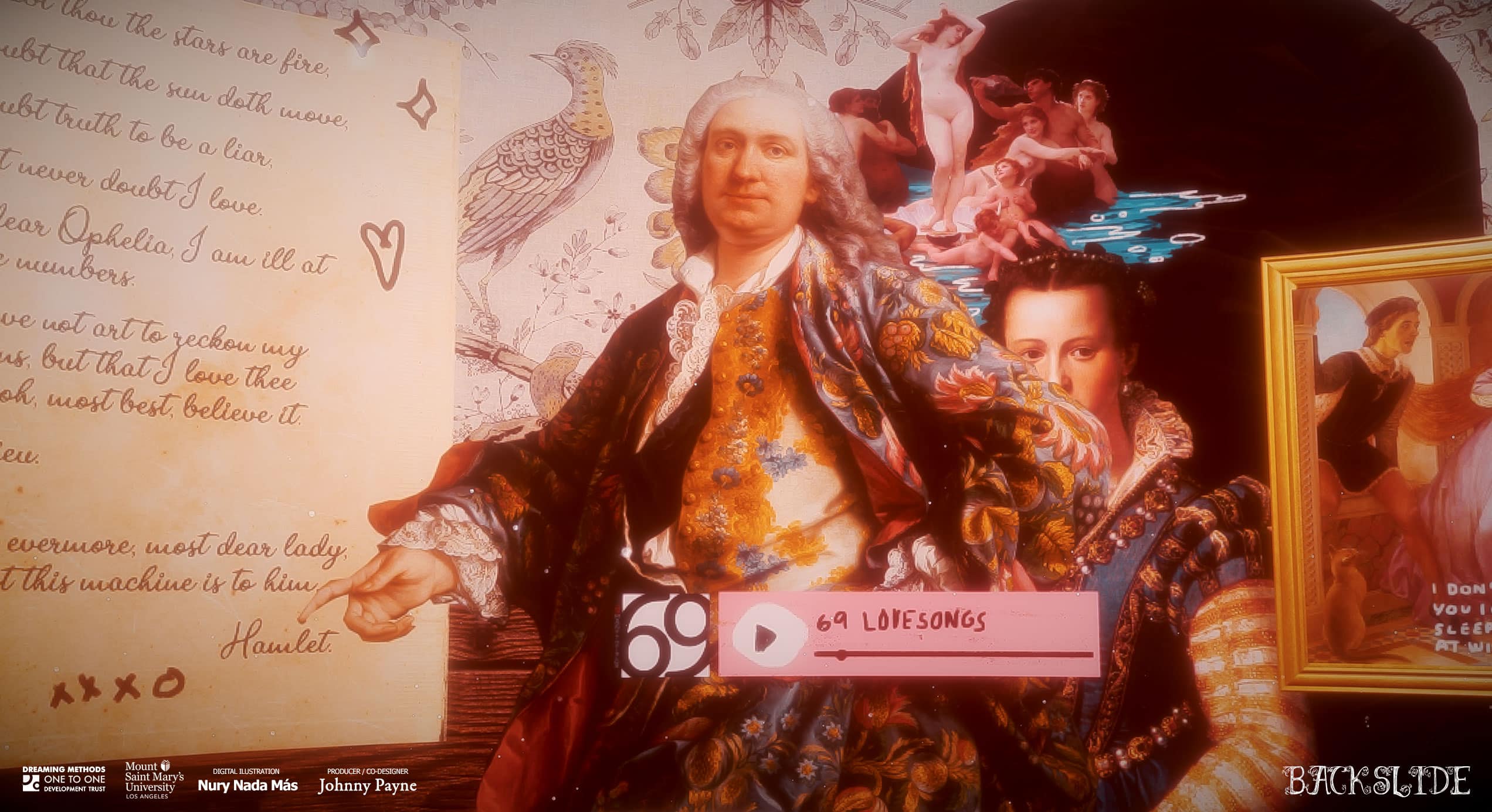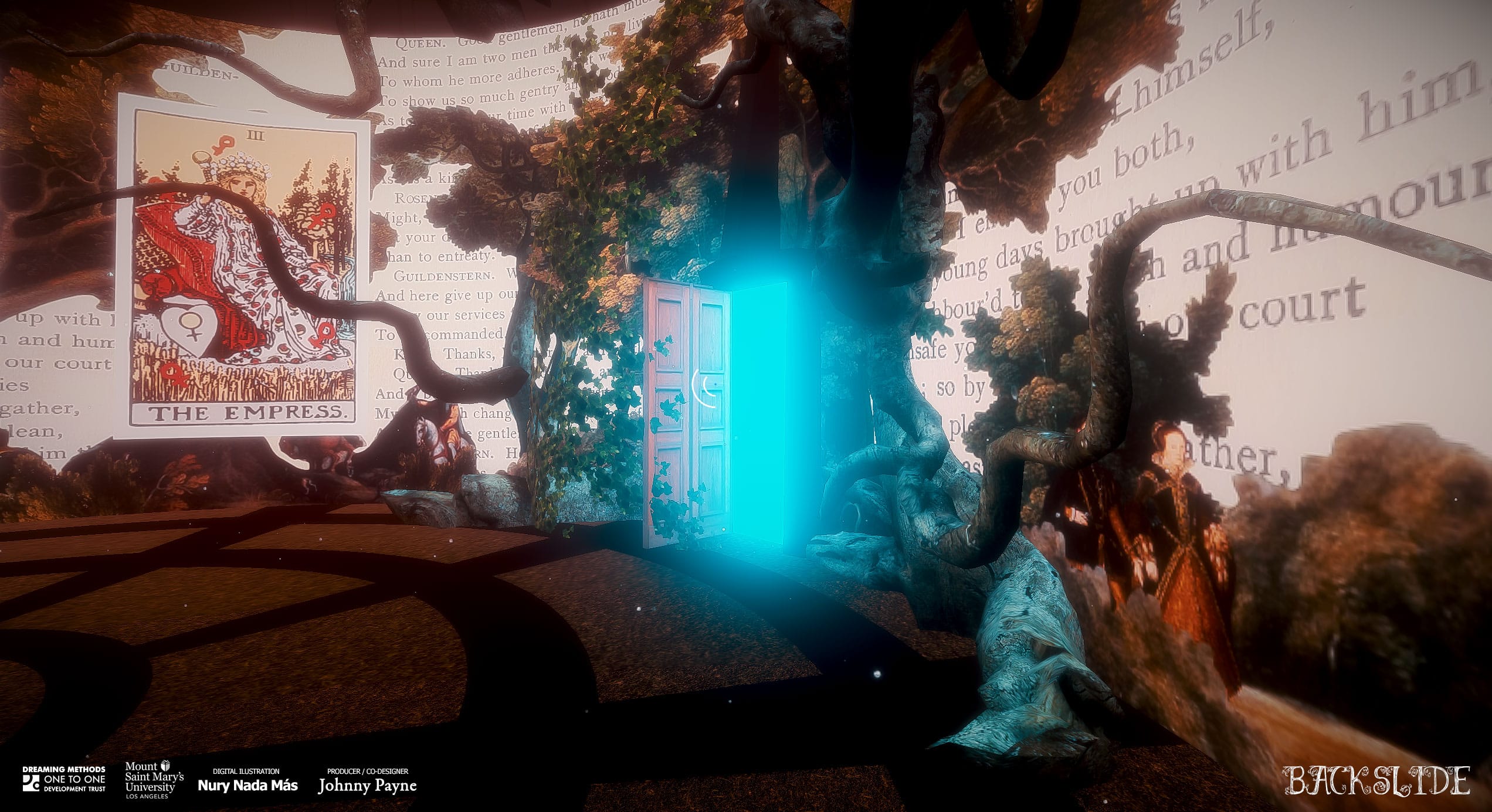 Backslide is a VR and browser-based experience for desktop and mobile aimed at encouraging new and creative playwriting. It's based around William Shakespeare’s Hamlet and Tom Stoppard’s Rosencrantz and Guildenstern are Dead (a metaphysical deconstruction of Hamlet). Students are also encouraged to read David Ball’s Backwards and Forwards: A Playwriting Manual, which teaches them to read Hamlet back to front, in order to understand logical causality in a play. An immersive 360 degree stage exploring character, drama and logical causality, Backslide is co-designed and produced by Director of Creative Writing Johnny Payne (Mount St Mary's University, LA) and features animated 360 illustrations by Nury Nada Más.
