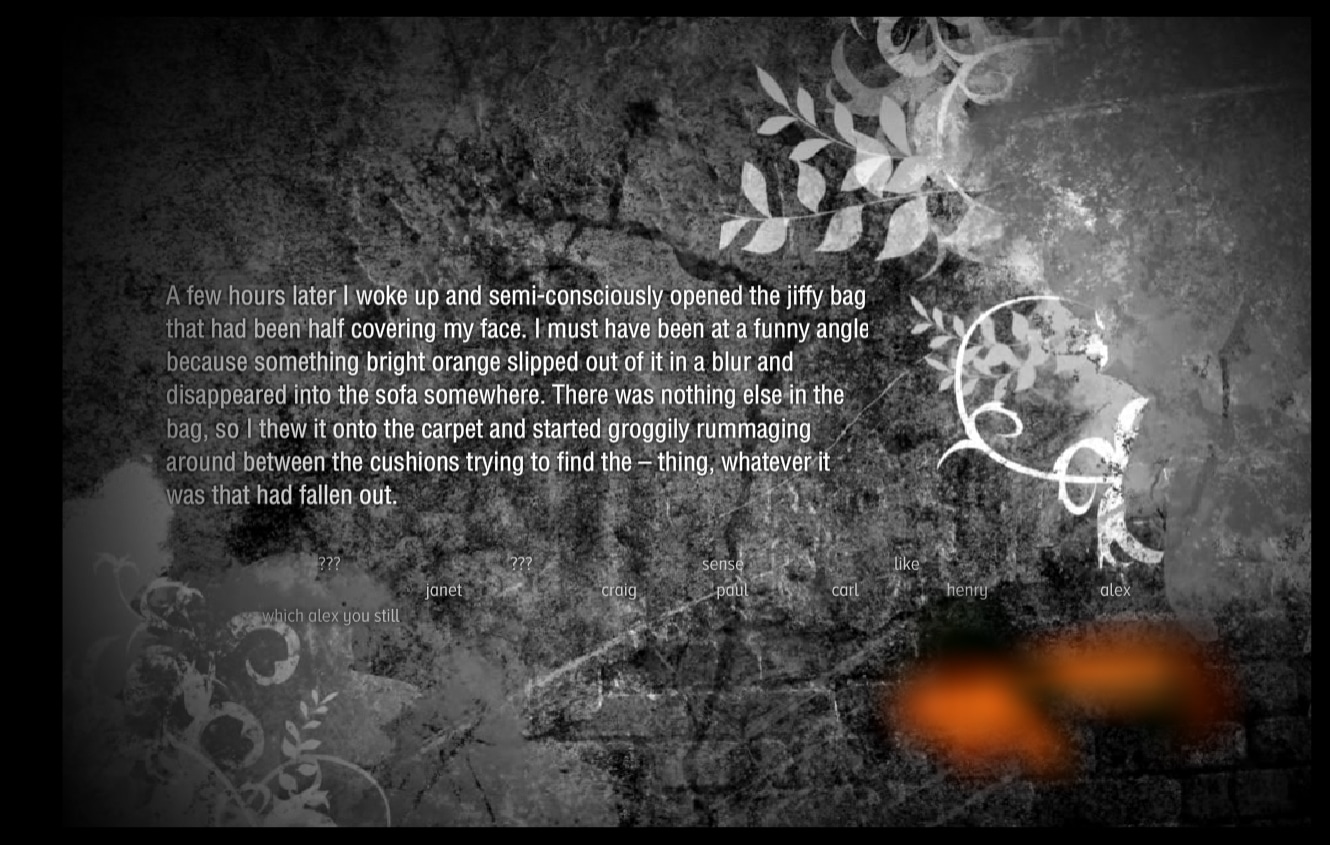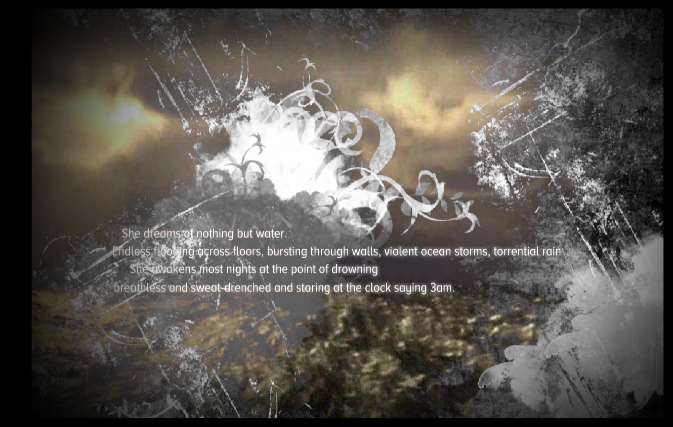 Created by Andy Campbell in 2009 and the last Flash project ever produced by Dreaming Methods, Glimmer revolves around a mysterious package sent through the post containing nothing but a small plastic fish, which triggers an emotional and unexpected memory in the work's protagonist. Glimmer includes transient poetic texts and a virtual ocean sequence rendered using Vue Infinite. Most of the visual sequences were rendered using After FX. Glimmer was published in Mad Hatter's Review - an online journal of digital art/writing - in 2013. It's now available to view without the need for Flash Player.