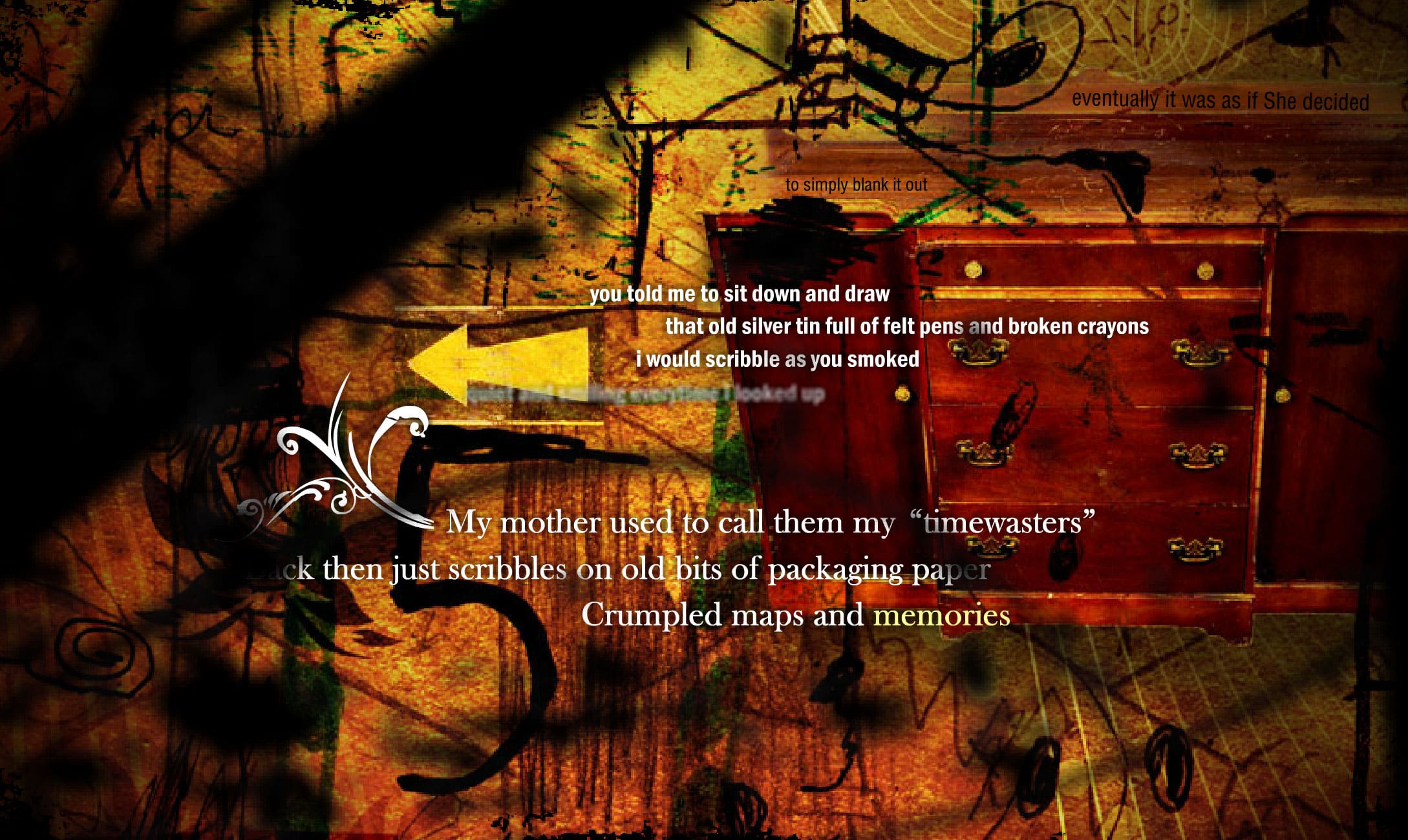 Told through a densely textured, mouse-responsive graphical environment, the work presents the user/reader with a series of transient texts, some of which change/mutate or float/disappear over time, intending to reflect the very nature of the hazy/difficult memories being uncovered. Progression through Dim O’Gauble is achieved by clicking on the various arrows visible in the graphical backgrounds, which quickly shift the viewport around the ‘canvas’ of the piece. In addition, various sub-sections of the narrative can be discovered by clicking on hotspots in the text.