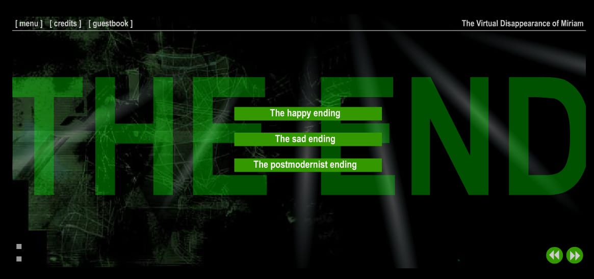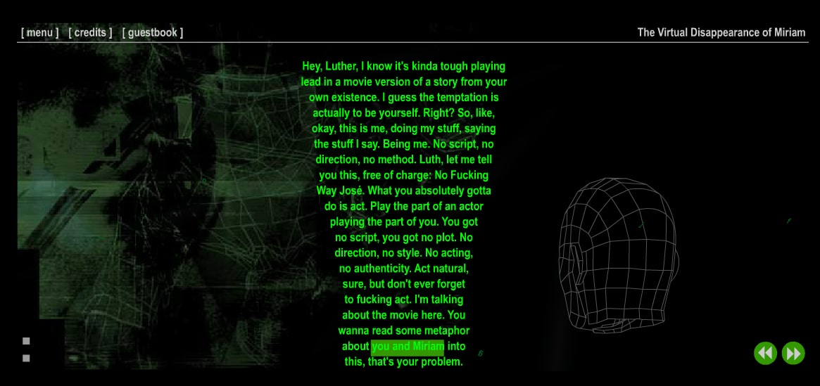 The reader moves through a series of linear short stories, following main character Luther's experience to find his missing girlfriend, Miriam. In each of the stories, Luther is faced with a digital environment, for example a computer game and a Quentin Tarantino movie set. There are three endings: happy, sad and post-modern. Contains strong language.