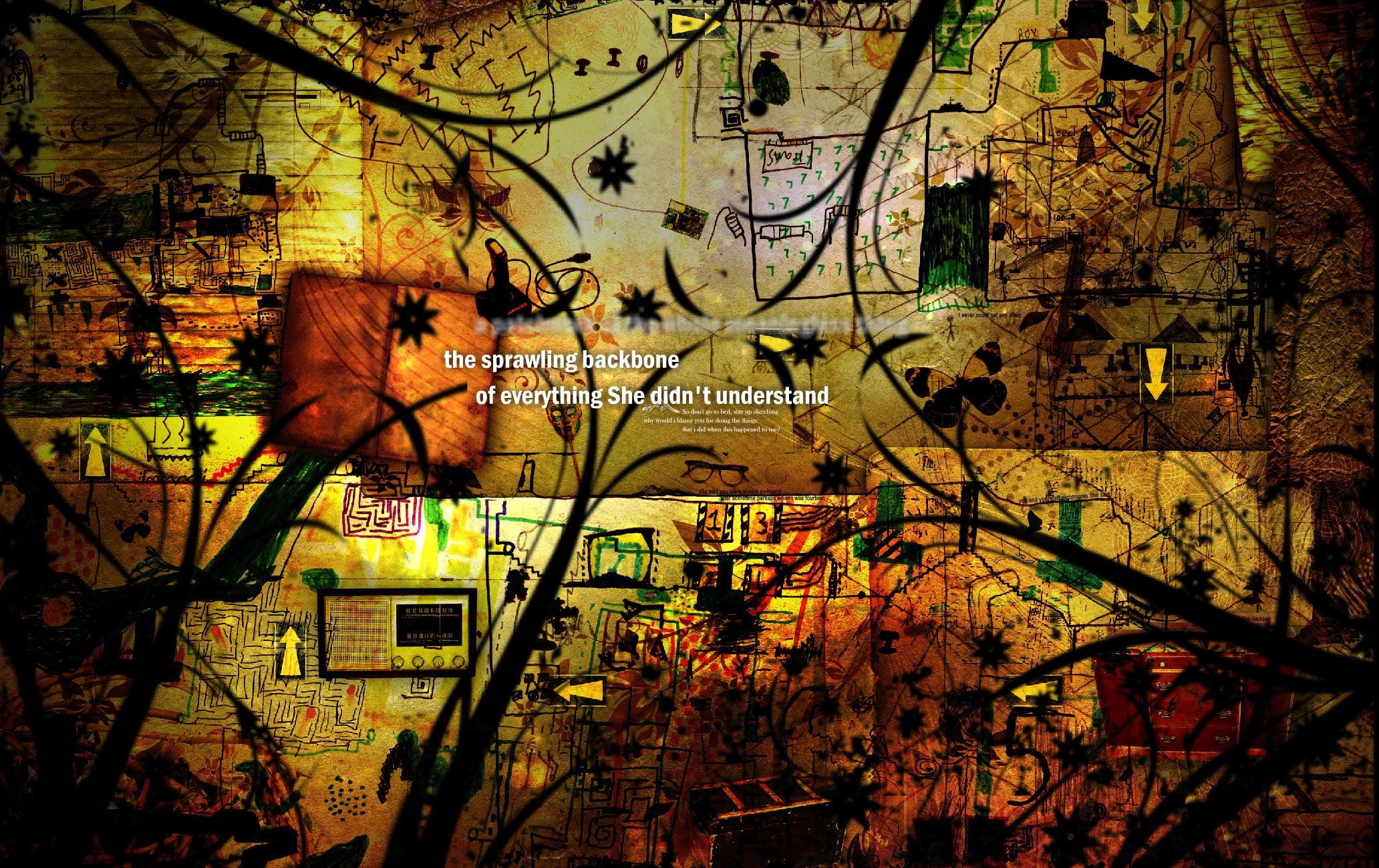 Told through a densely textured, mouse-responsive graphical environment, the work presents the user/reader with a series of transient texts, some of which change/mutate or float/disappear over time, intending to reflect the very nature of the hazy/difficult memories being uncovered. Progression through Dim O’Gauble is achieved by clicking on the various arrows visible in the graphical backgrounds, which quickly shift the viewport around the ‘canvas’ of the piece. In addition, various sub-sections of the narrative can be discovered by clicking on hotspots in the text.